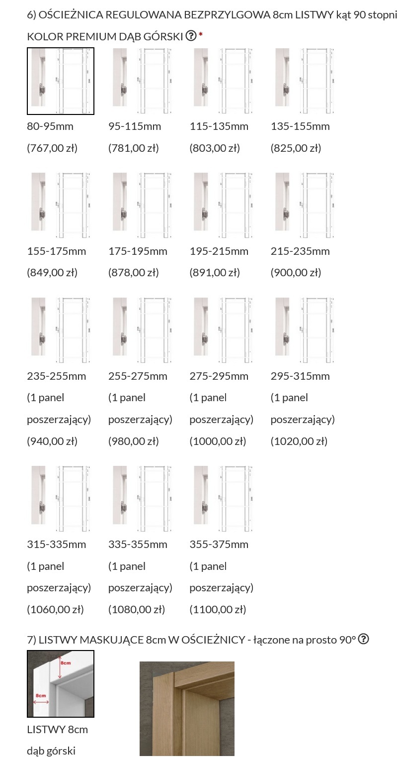 ✔ ościeżnicę regulowaną bezprzylgową (LISTWY MASKUJĄCE 8cm w ościeżnicy – łączone na prosto 90°) (dodatkowa opłata – naliczana automatycznie wybierając zakres regulacji ościeżnicy)