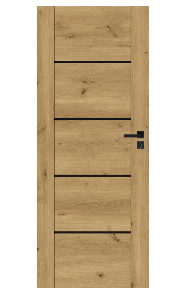 Proponowany model to skrzydło drzwiowe wykonane z ramiaków MDF uszlachetnionych okleiną drewnopodobną o zwiększonej odporności na zarysowania.